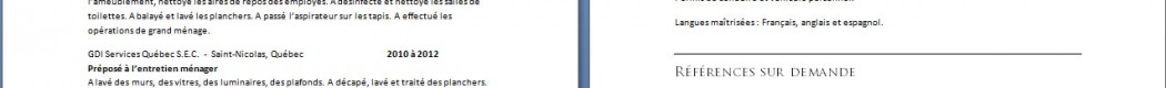 Prénom Nom 678 de la Rue 514-123-1234 Montréal, Québec, Code Postal courriel@exempledecv.info Objectif : Préposé à l’entretien ménager Expérience Professionnelle Entretien Lavande – St-Etienne-de-Lauzon, Québec 2014 à aujourd’hui Préposé à l’entretien ménager A fait le ménager dans plusieurs entreprises pendant la Entretien Ménager Unik – St-Romuald, Québec 2012 à 2014 Préposé à l’entretien ménager A fait l’entretien ménager léger GDI Services Québec S.E.C. – Saint-Nicolas, Québec 2010 à 2012 Préposé à l’entretien ménager A lavé des murs, des vitres, des ABM International Inc. – Lévis, Québec 2006 à 2010 Préposé à l’entretien ménager A lavé et balayé les planchers